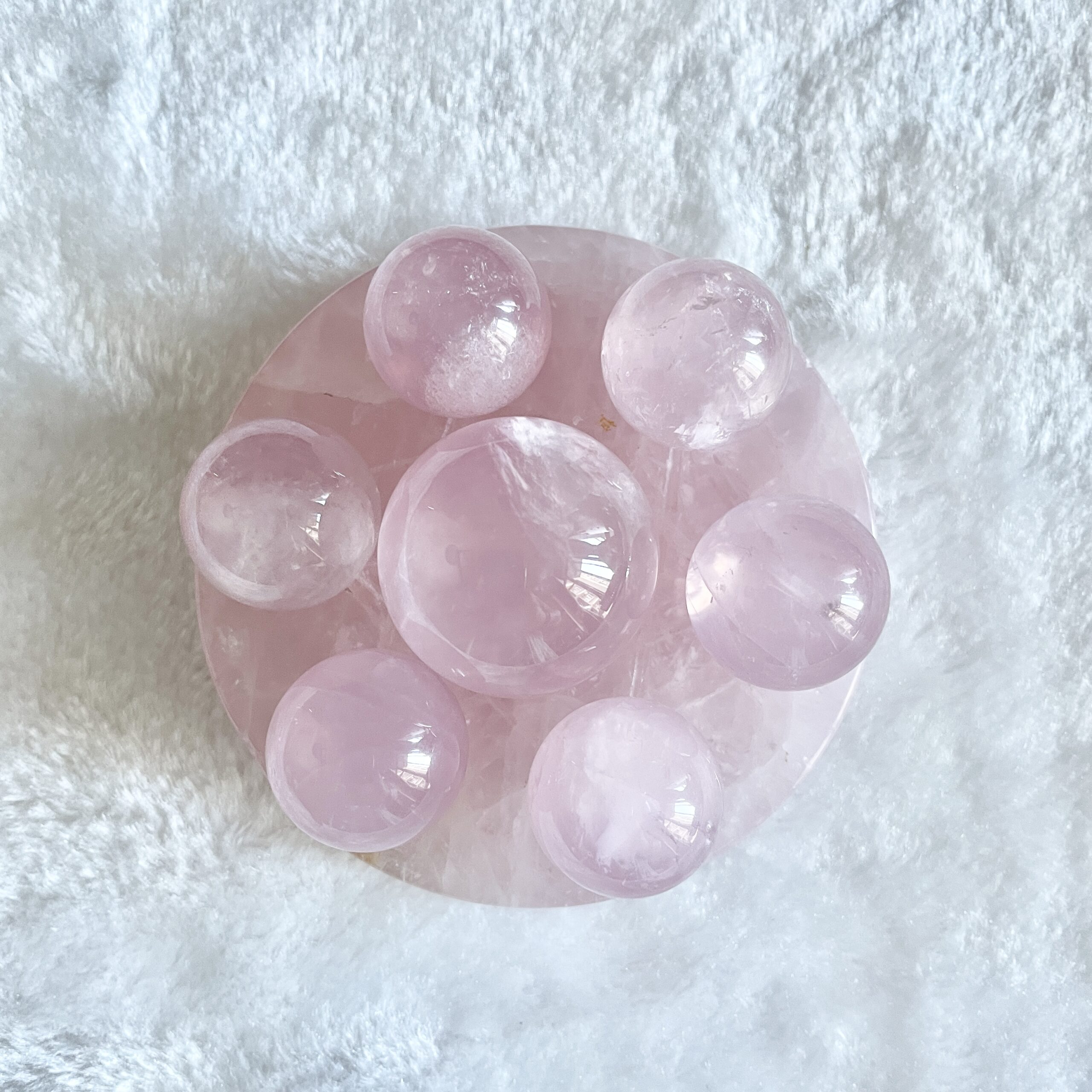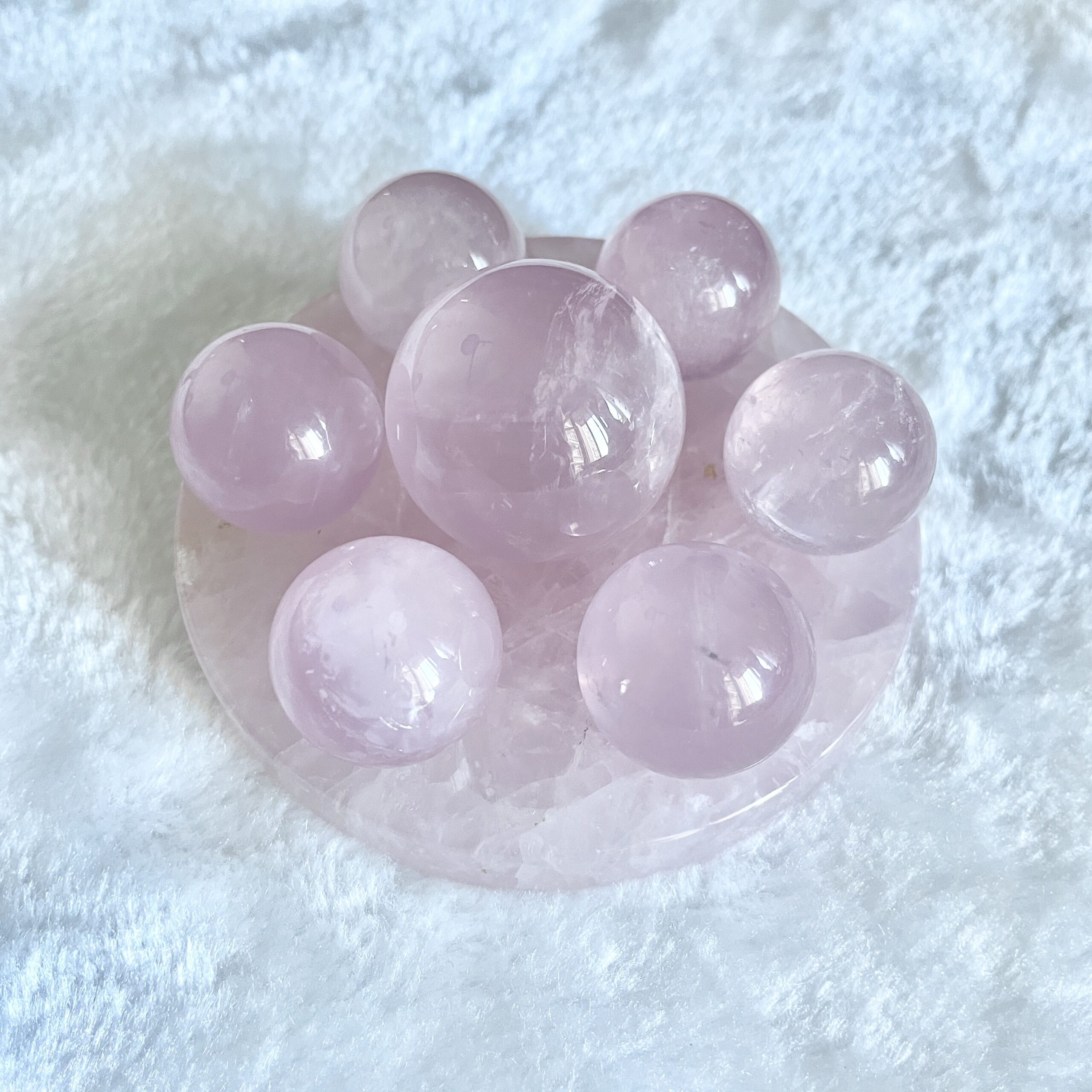 這個粉晶圓球比另一個七星陣的水晶球通透,能量差不多,可按喜好挑選。